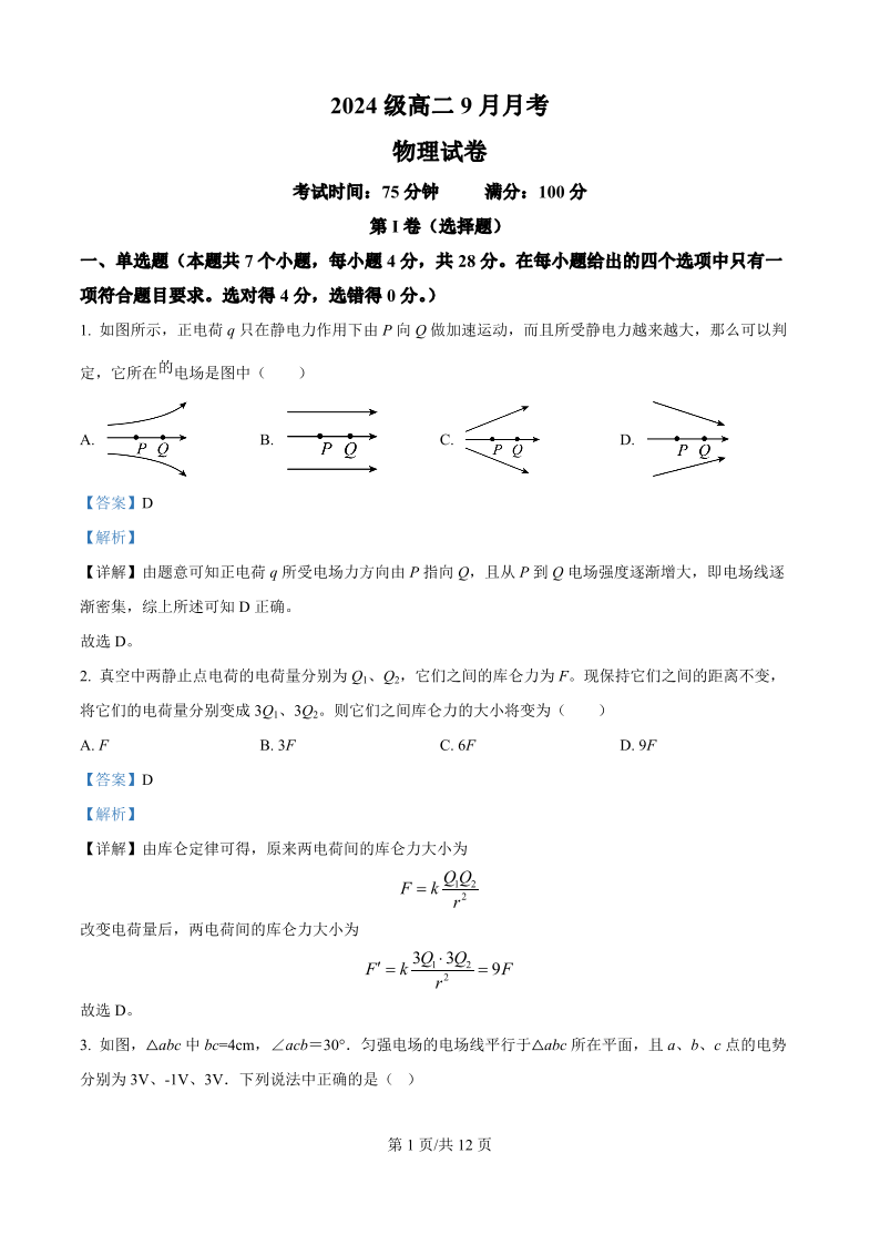高二物理(精品解析版)--四川省眉山市仁寿第一中学校(北校区)2025-2026学年高二上学期9月月考