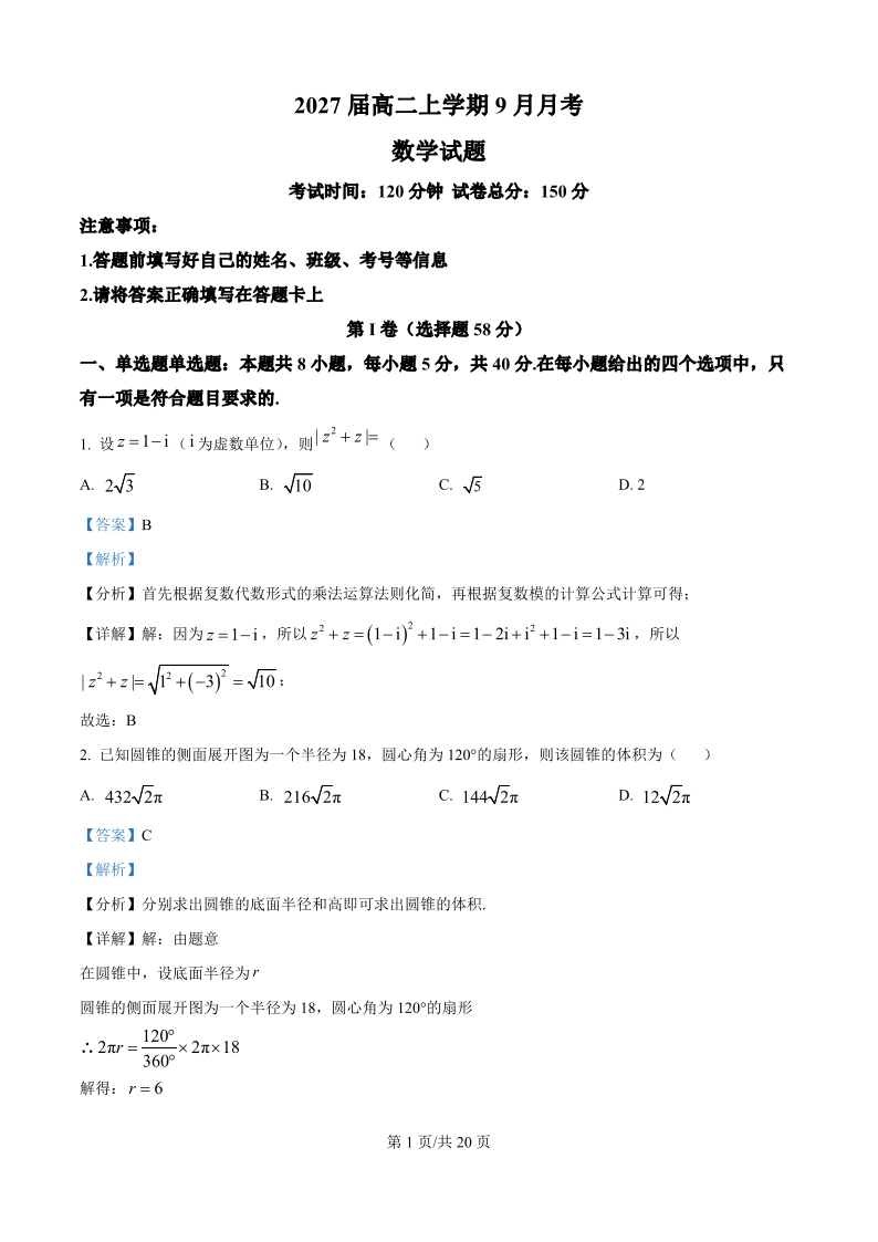 高二数学(精品解析版)--四川省眉山市仁寿第一中学校(南校区)2025-2026学年高二上学期9月月考