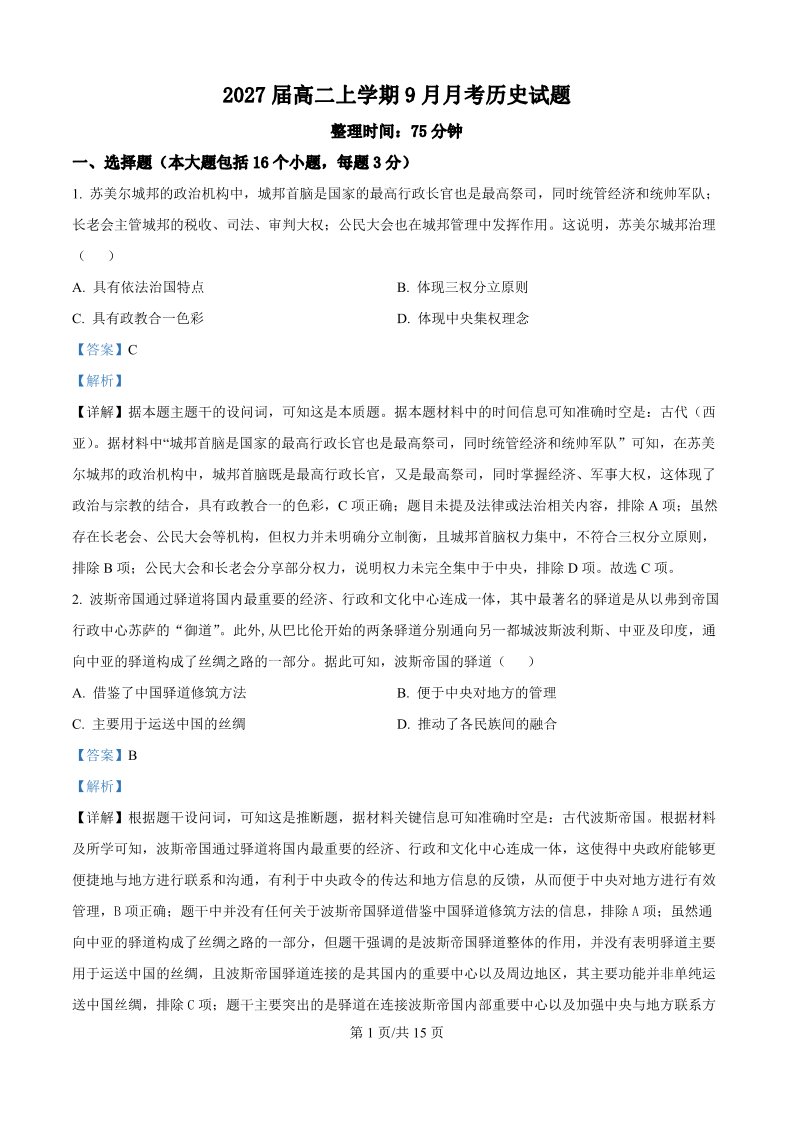 高二历史(精品解析版)--四川省眉山市仁寿第一中学校(南校区)2025-2026学年高二上学期9月月考