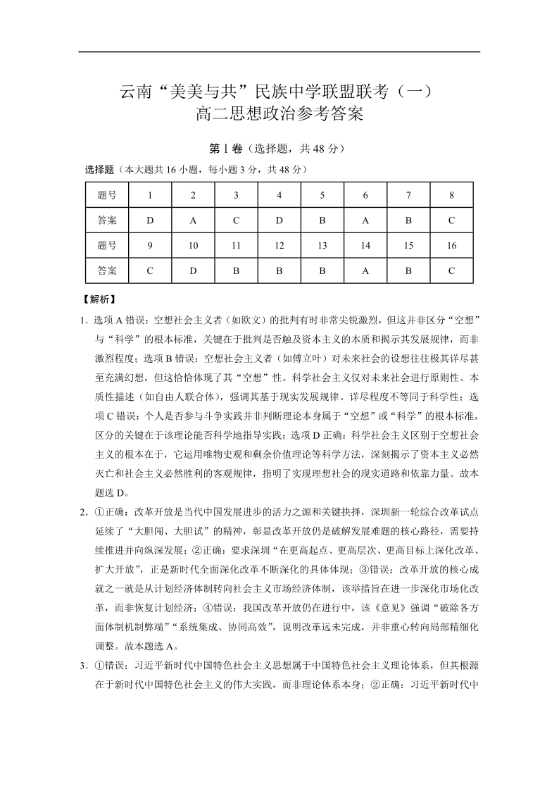 高二政治答案--云南省“美美与共”民族中学联盟2025-2026学年高二上学期联考(一)