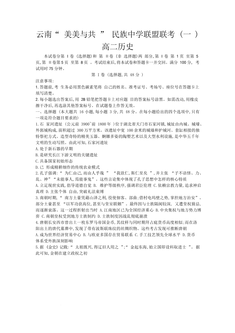 高二历史+答案--云南省“美美与共”民族中学联盟2025-2026学年高二上学期联考(一)
