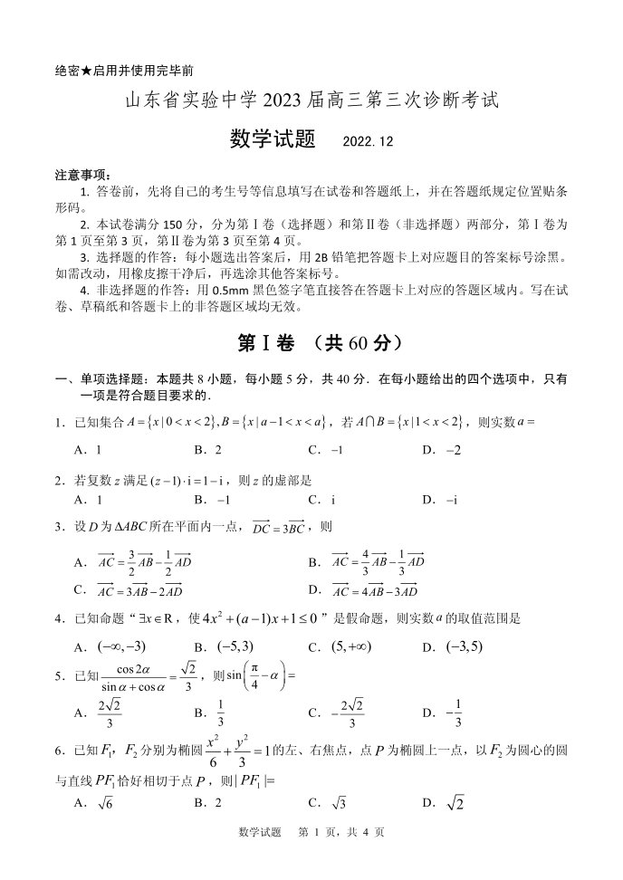 高三数学-山东省实验中学2022-2023学年高三上学期12月第三次诊断考试