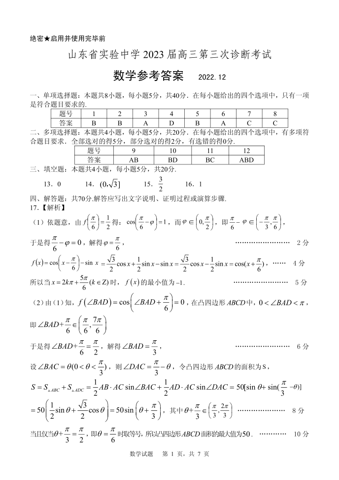 高三数学答案-山东省实验中学2022-2023学年高三上学期12月第三次诊断考试
