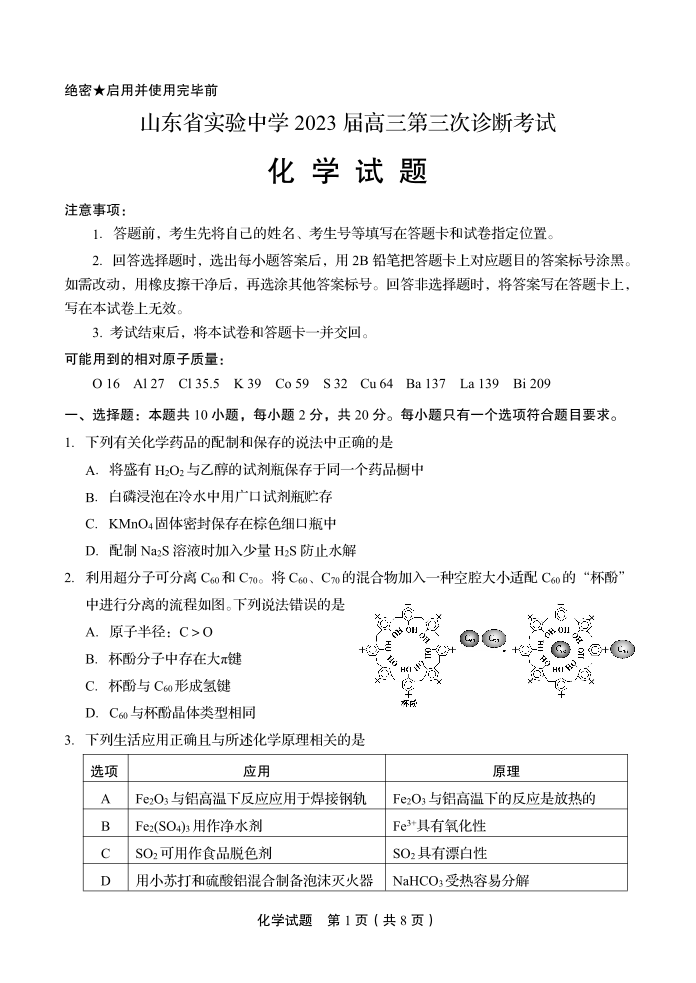 高三化学-山东省实验中学2022-2023学年高三上学期12月第三次诊断考试
