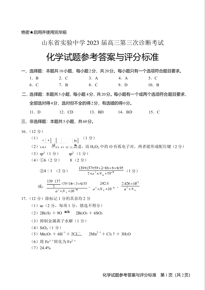 高三化学答案-山东省实验中学2022-2023学年高三上学期12月第三次诊断考试
