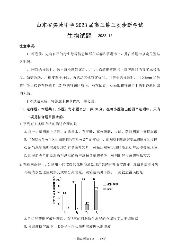 高三生物-山东省实验中学2022-2023学年高三上学期12月第三次诊断考试