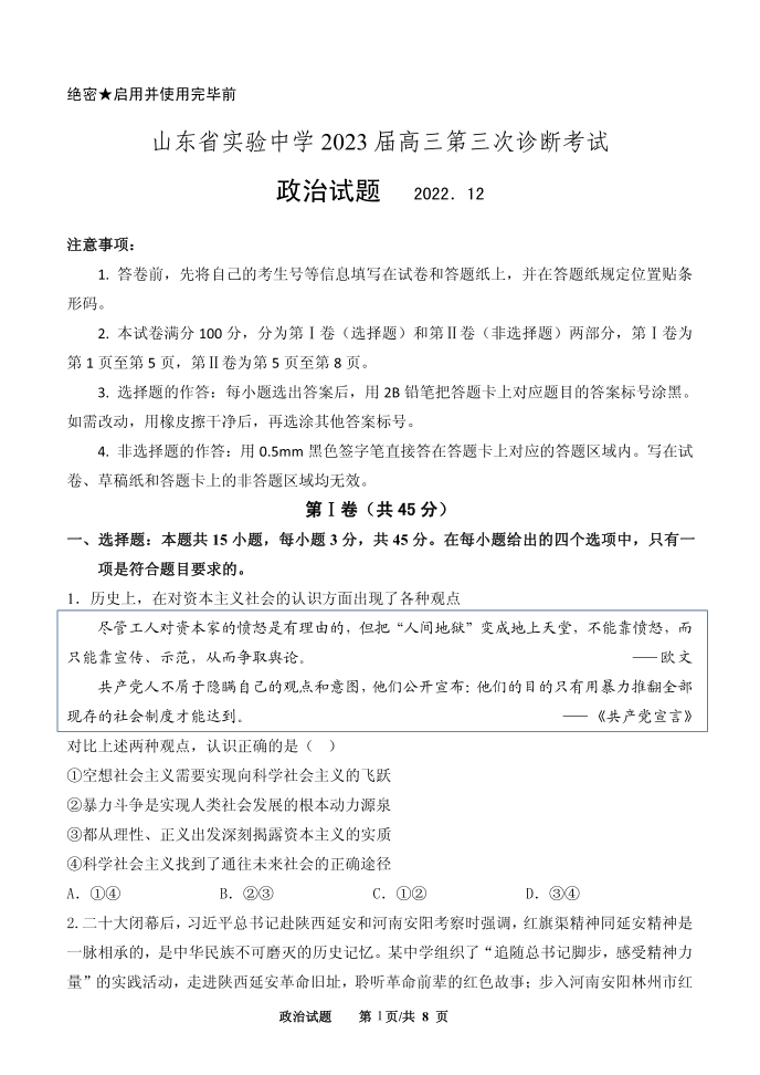 高三政治-山东省实验中学2022-2023学年高三上学期12月第三次诊断考试