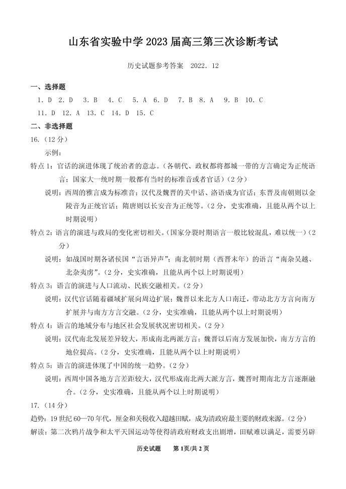 高三历史答案-山东省实验中学2022-2023学年高三上学期12月第三次诊断考试