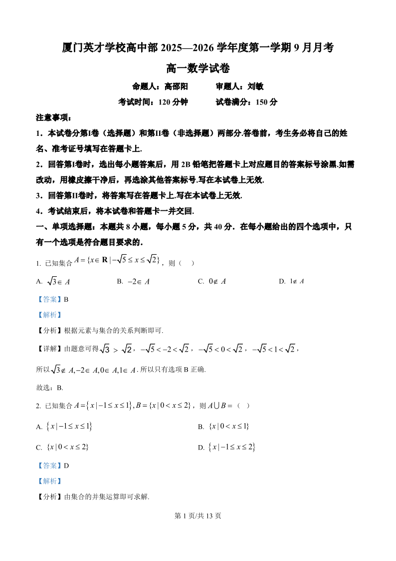 高一数学(精品解析版)--福建省厦门英才学校2025-2026学年高一上学期第一次月考
