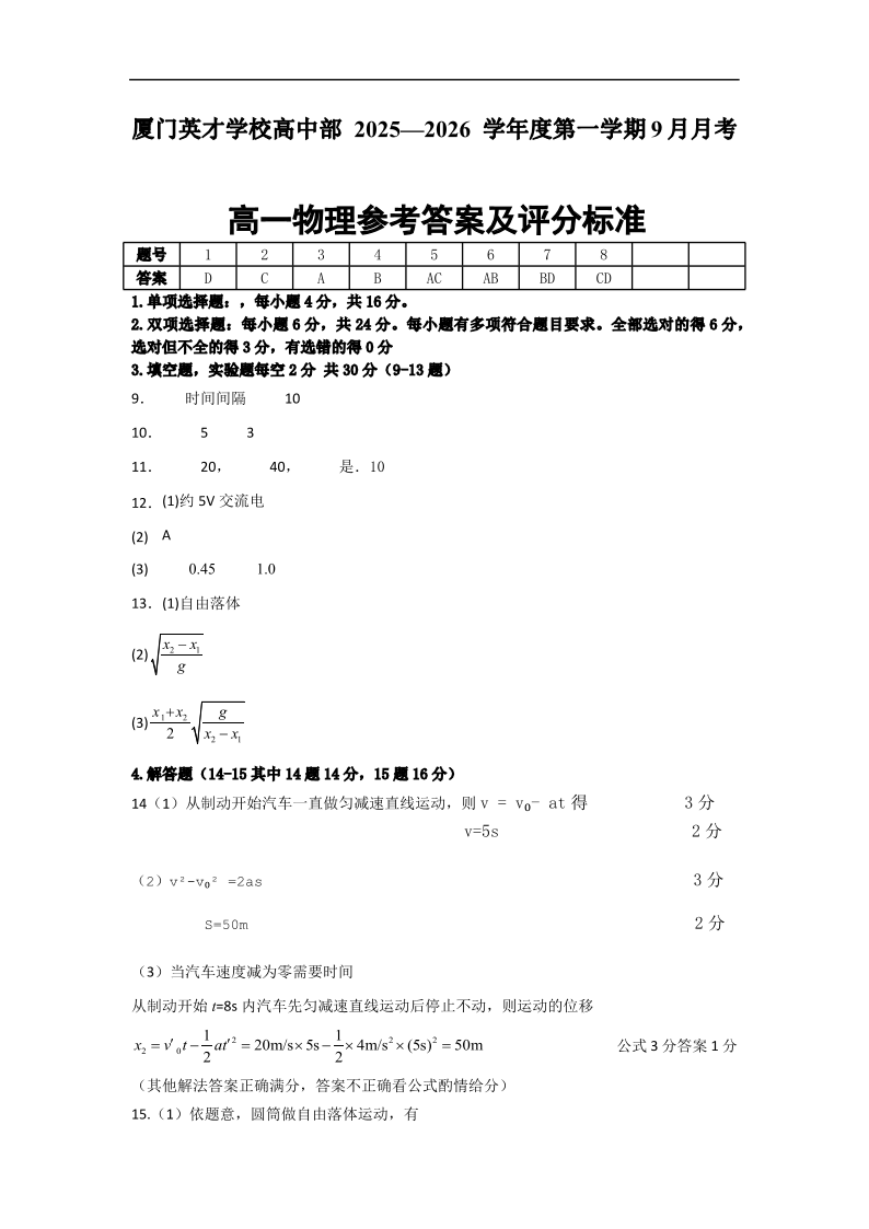 高一物理--福建省厦门英才学校2025-2026学年高一上学期第一次月考