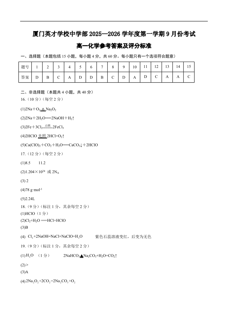 高一化学答案--福建省厦门英才学校2025-2026学年高一上学期第一次月考