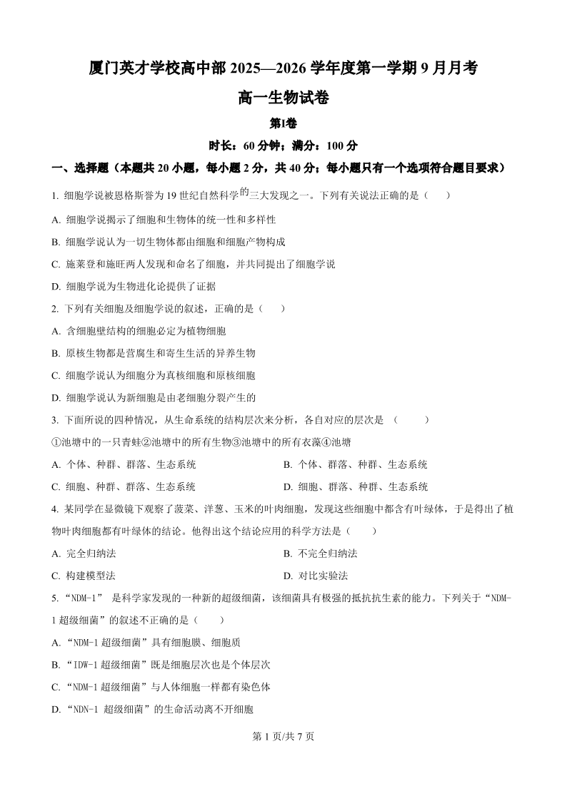 高一生物(原卷版)--福建省厦门英才学校2025-2026学年高一上学期第一次月考