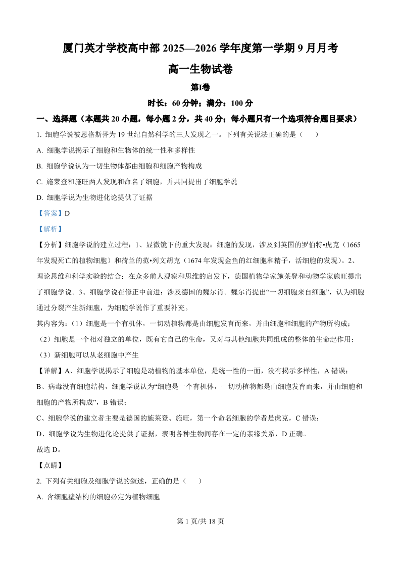 高一生物(精品解析版)--福建省厦门英才学校2025-2026学年高一上学期第一次月考