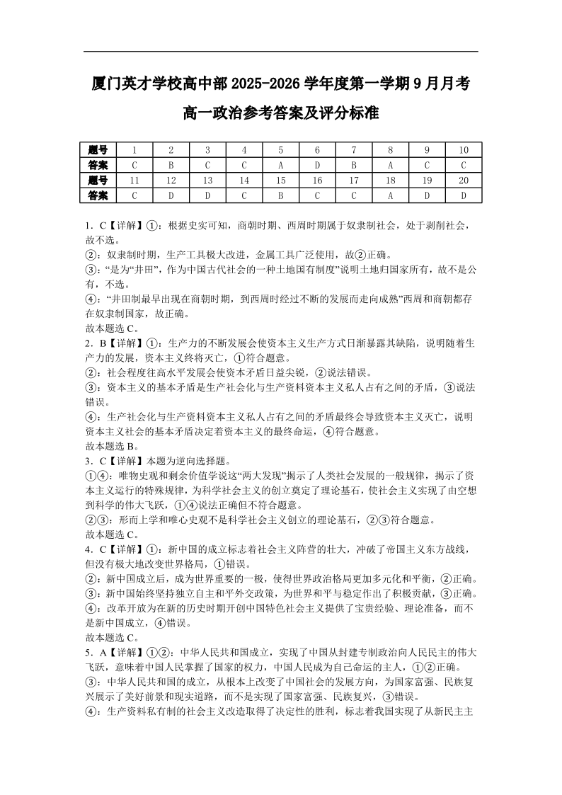 高一政治答案--福建省厦门英才学校2025-2026学年高一上学期第一次月考