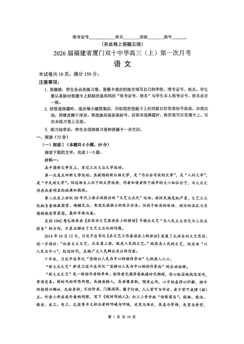 高三语文+答案--福建省厦门双十中学2025-2026学年高三上学期10月月考