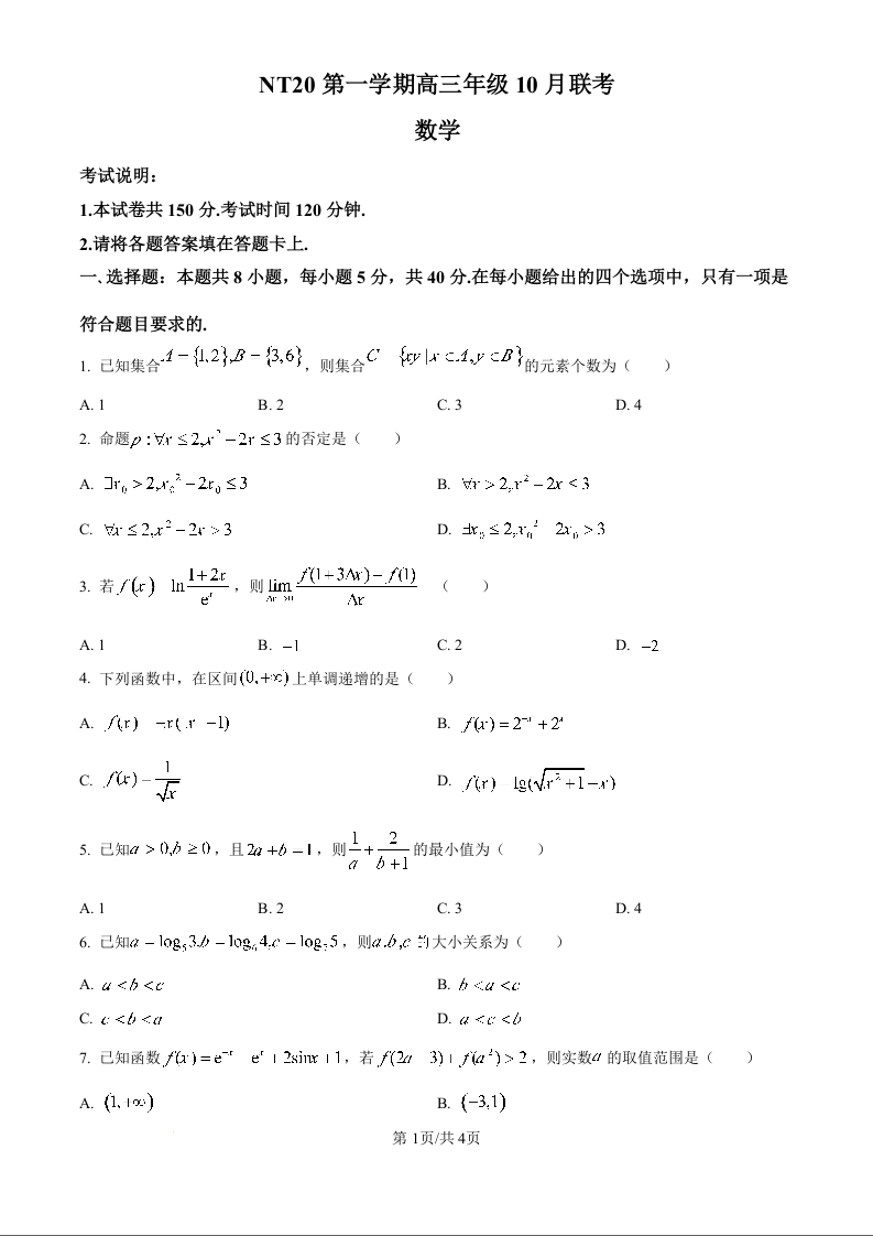 高三数学(原卷)--河北省NT教育2026届高三上学期10月联考