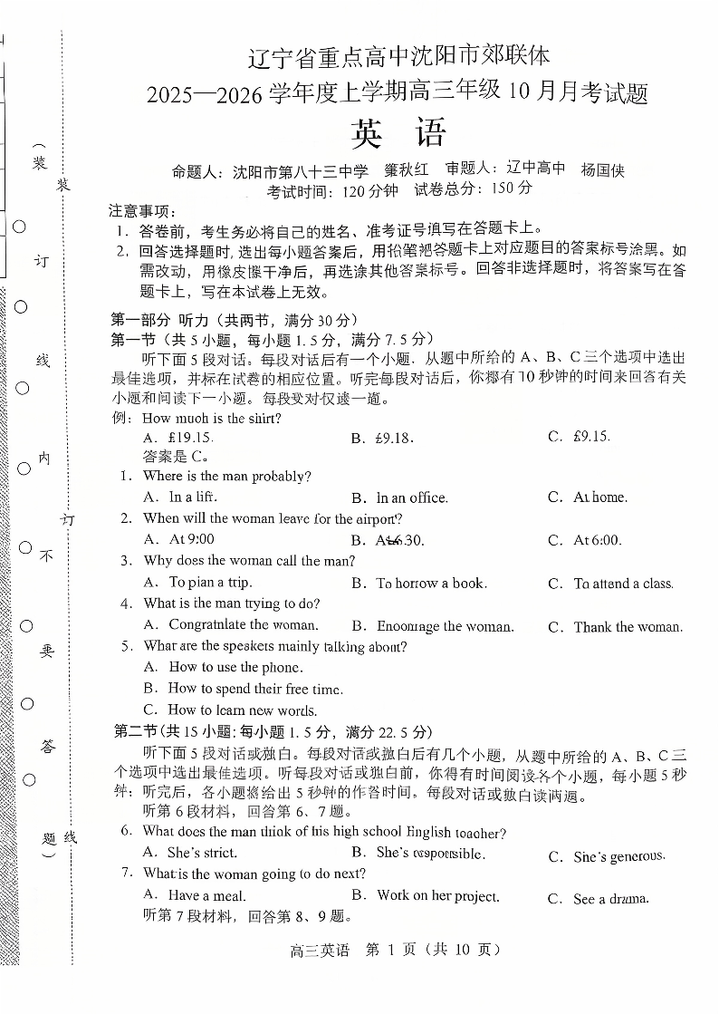 高三英语+答案--辽宁省沈阳市郊联体2026届高三上学期10月月考