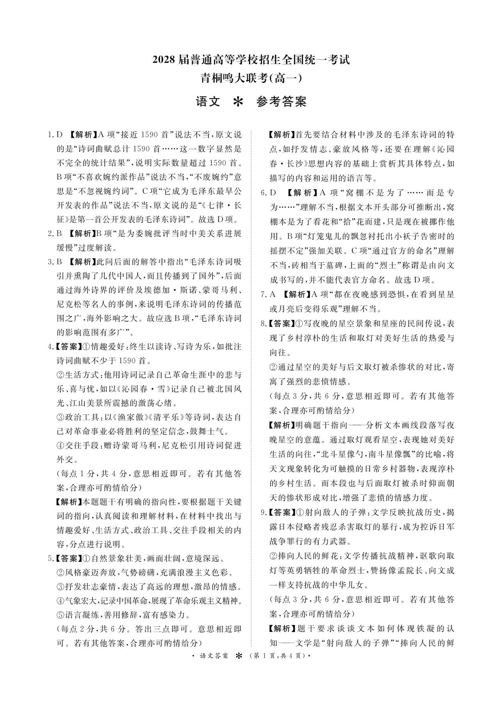 高一语文答案--河南省青桐鸣高一10月大联考2028届普通高等学校招生全国统一考试