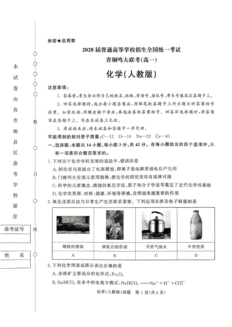 高一化学--河南省青桐鸣高一10月大联考2028届普通高等学校招生全国统一考试