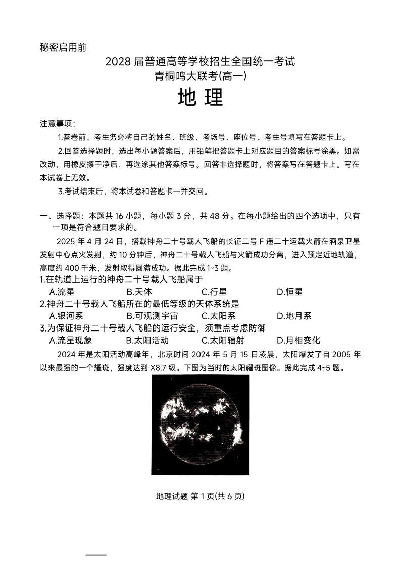 高一地理+答案--河南省青桐鸣高一10月大联考2028届普通高等学校招生全国统一考试