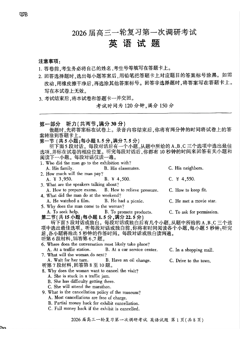 高三英语--百师联盟2026届高三上学期第一次调研考试(10月)