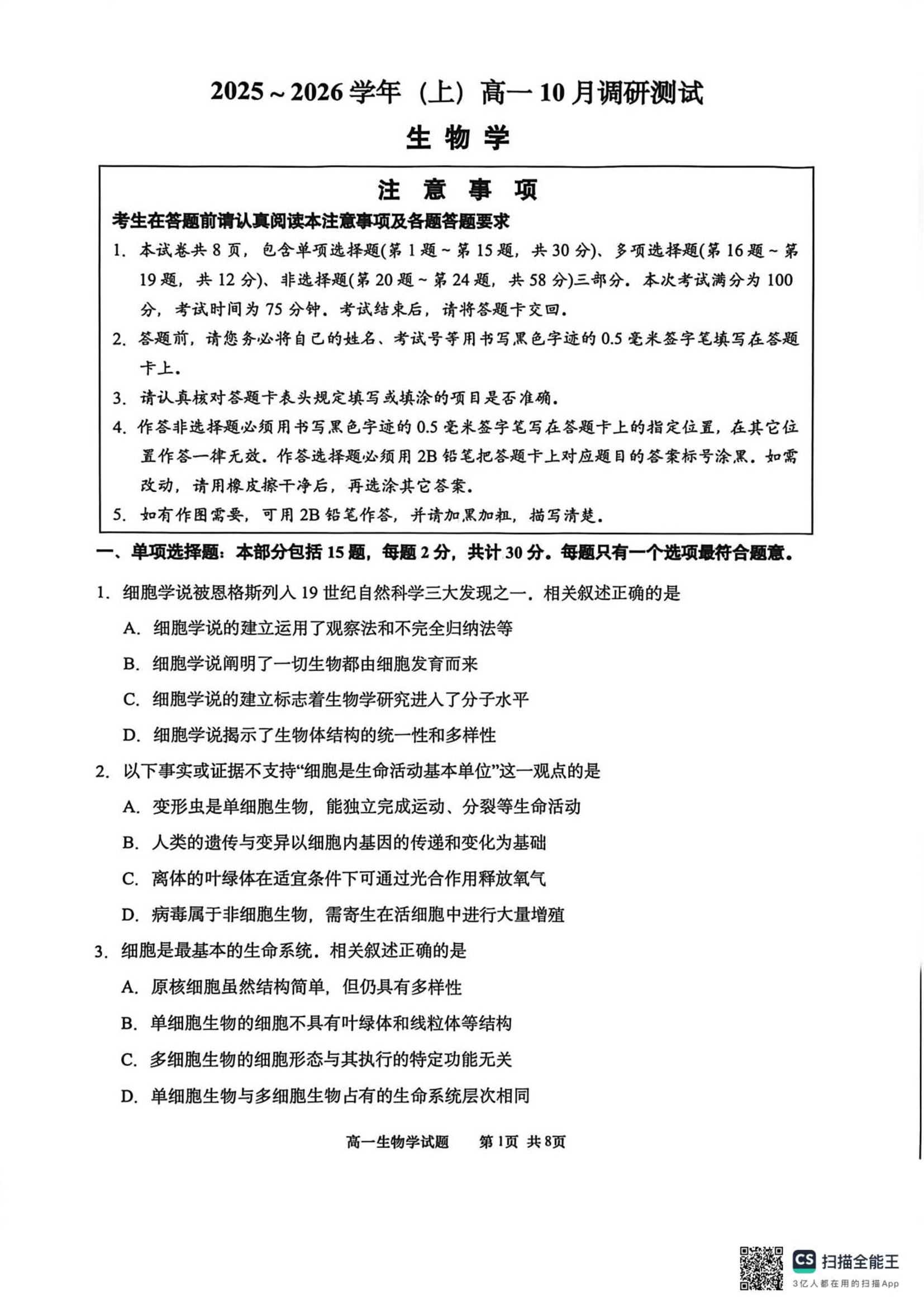 高一生物--江苏省南通市2025-2026学年高一上学期10月调研测试