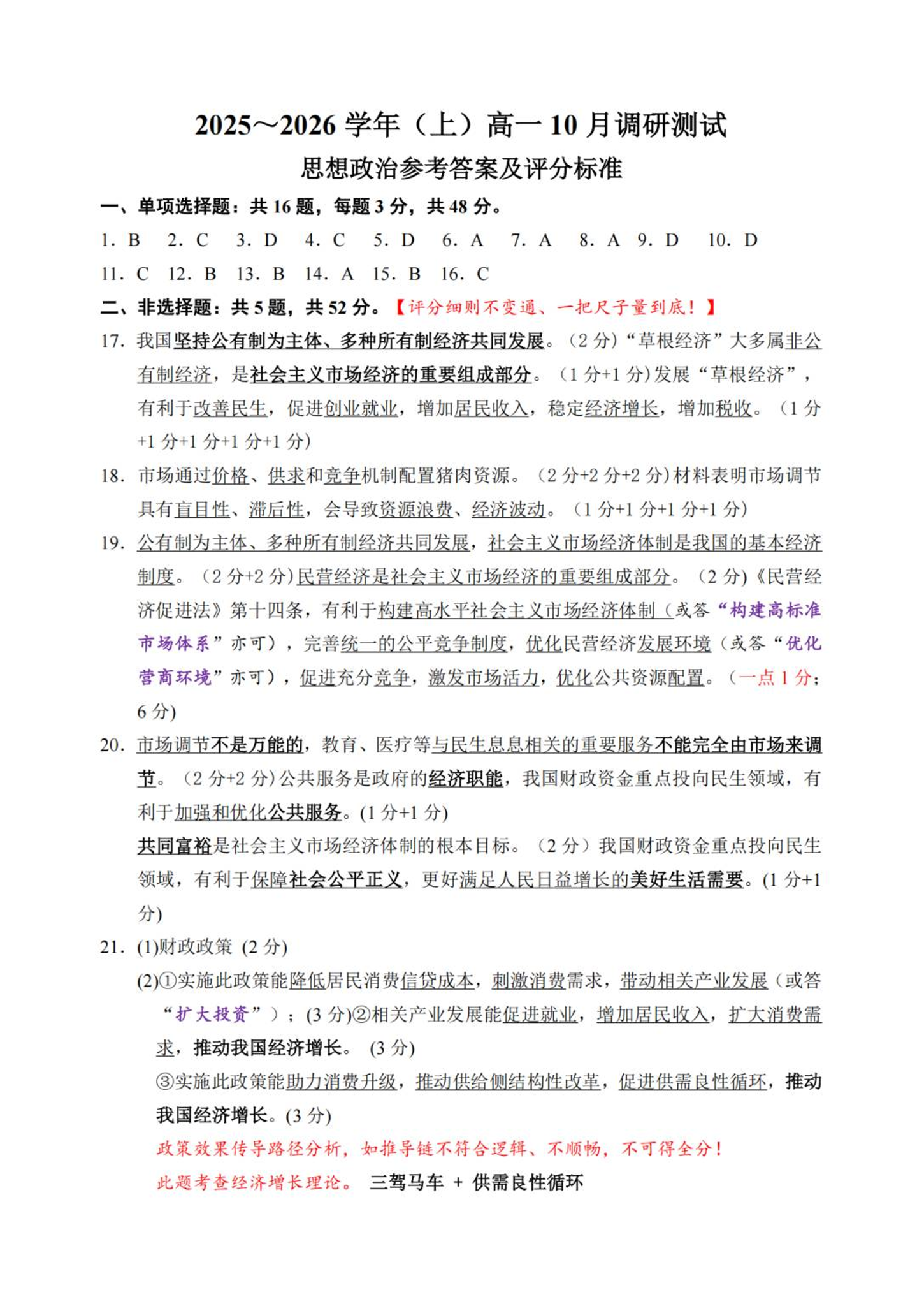 高一政治答案--江苏省南通市2025-2026学年高一上学期10月调研测试