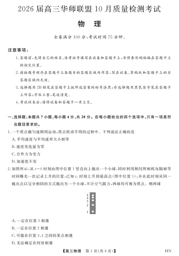 高三物理--华师联盟2026届高三10月质量检测考试