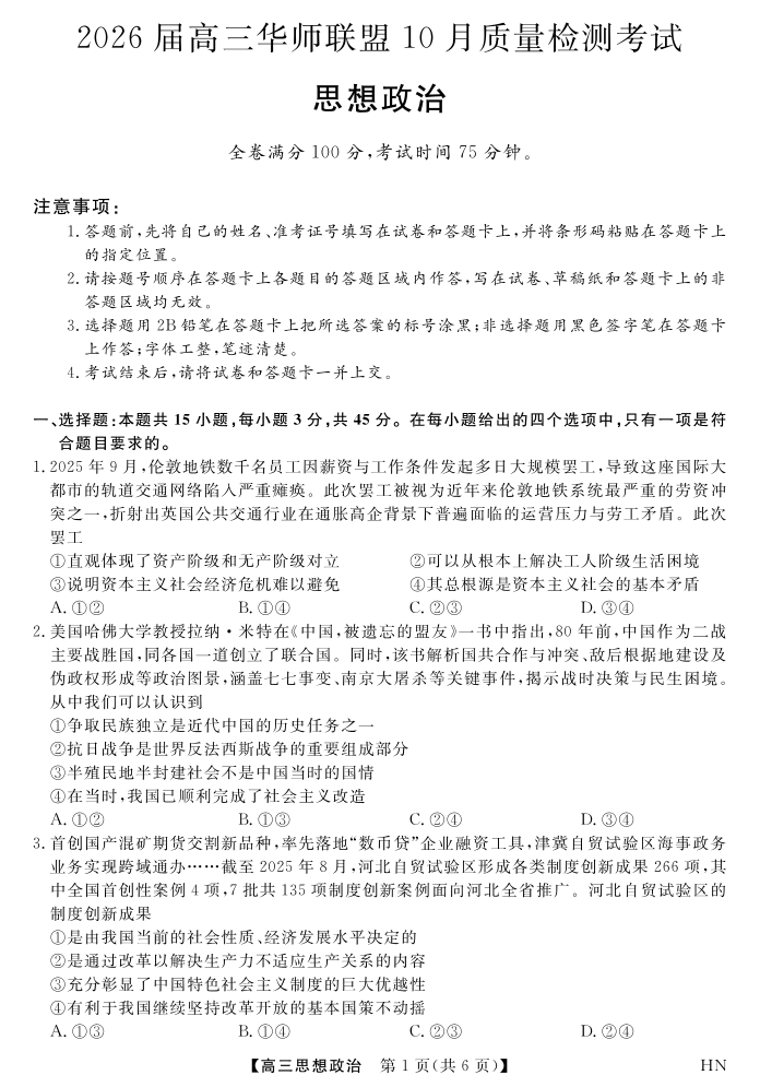 高三政治--华师联盟2026届高三10月质量检测考试