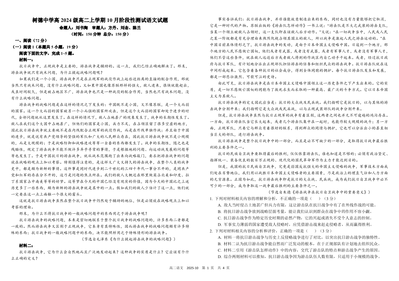 高二语文--四川省成都市树德中学2025-2026学年高二上学期10月月考