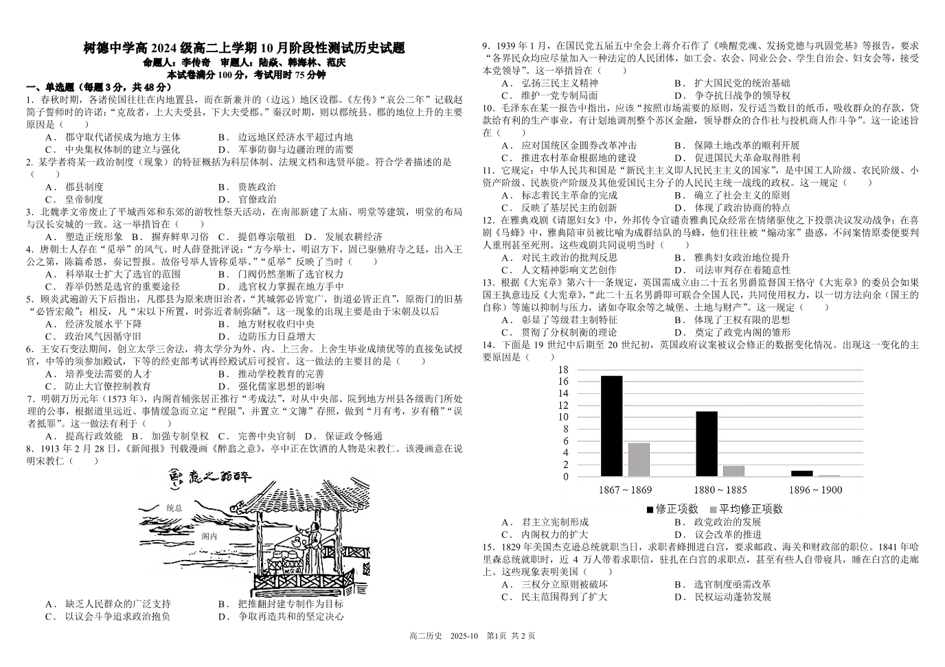 高二历史+答案--四川省成都市树德中学2025-2026学年高二上学期10月月考