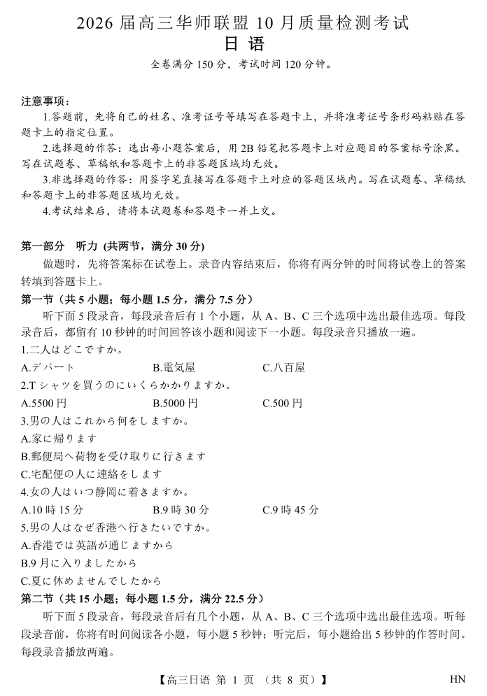 高三日语--华师联盟2026届高三10月质量检测考试