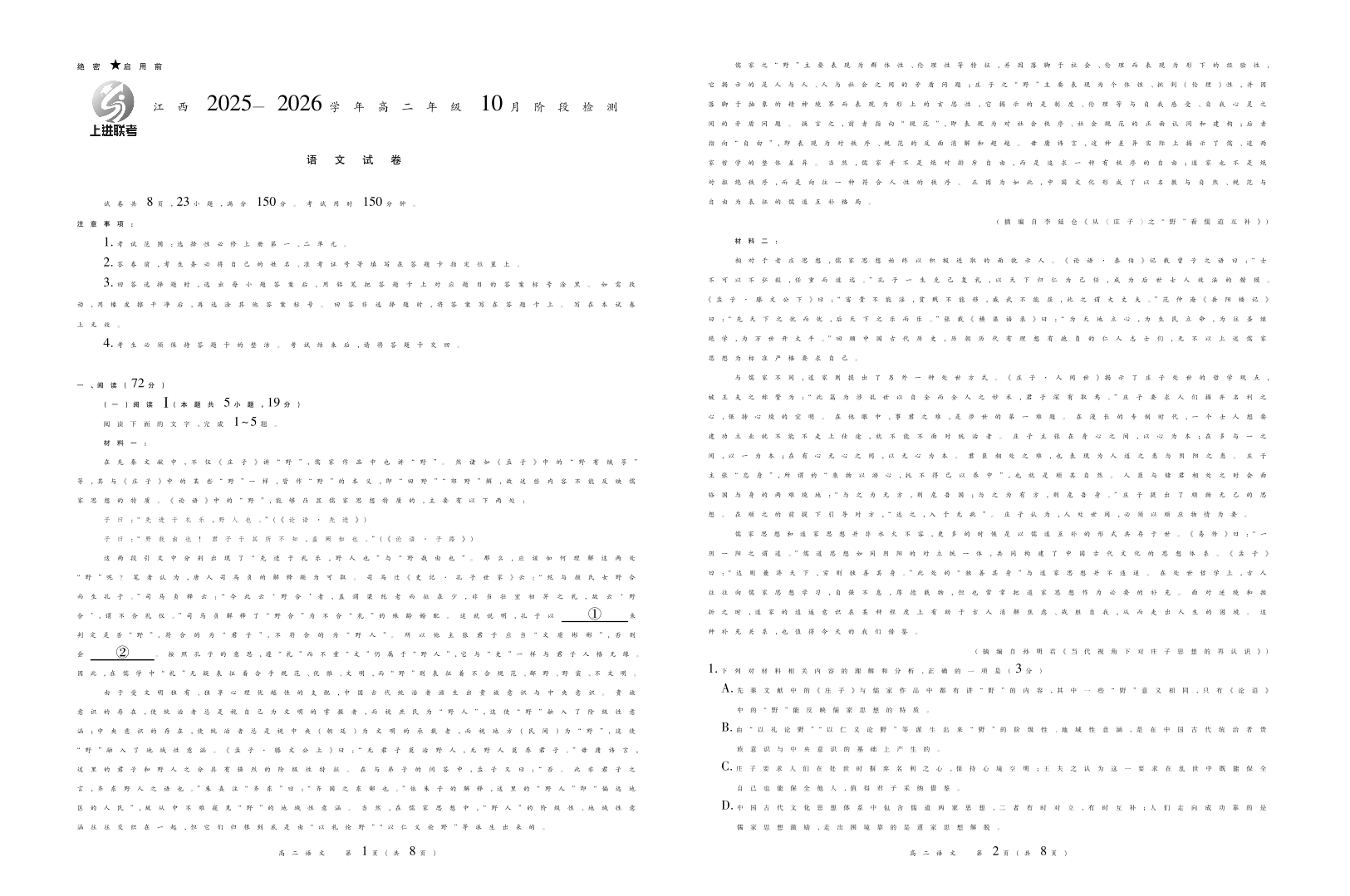 高二语文--江西省上进联考2025—2026学年高二年级10月阶段检测