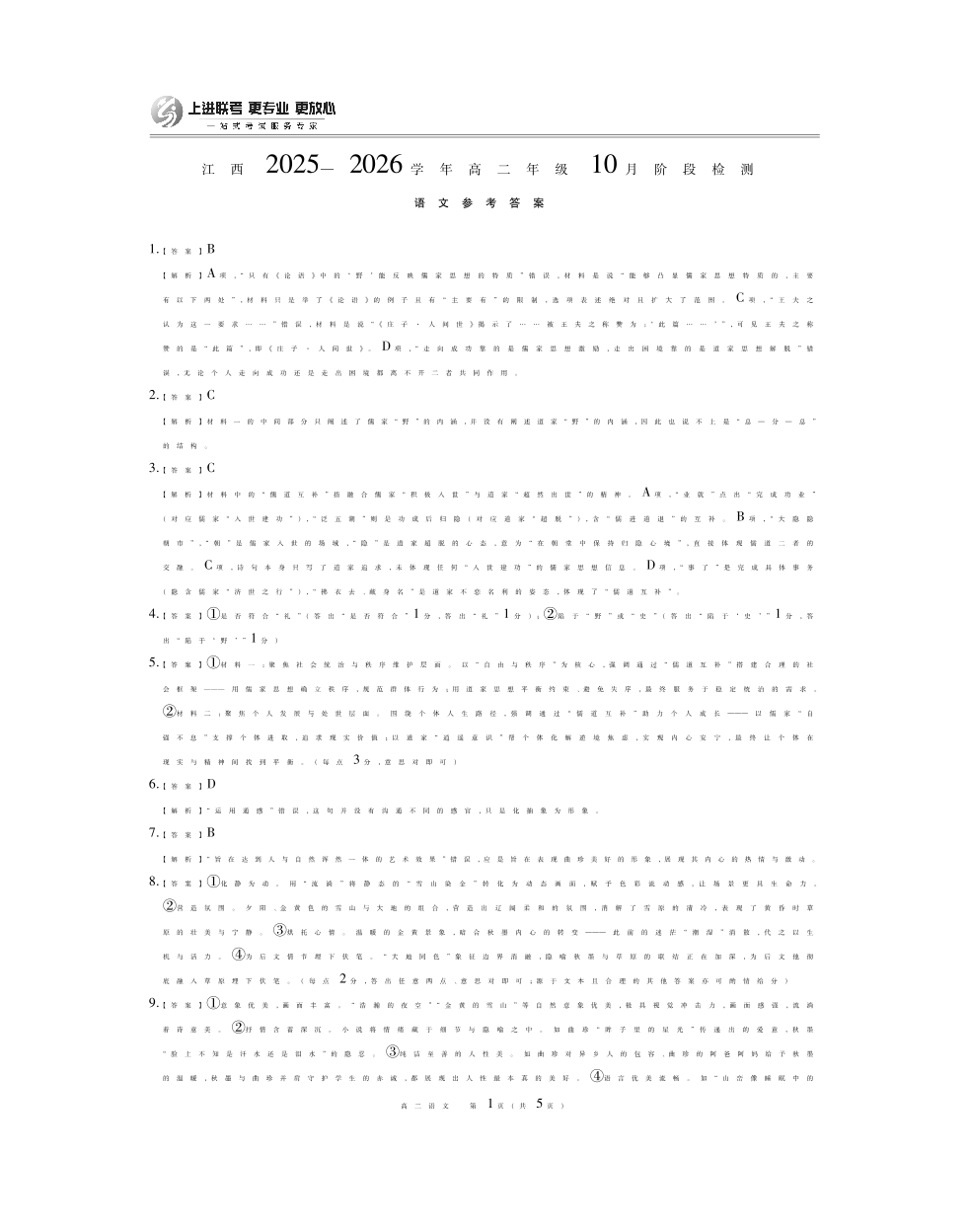 高二语文答案--江西省上进联考2025—2026学年高二年级10月阶段检测