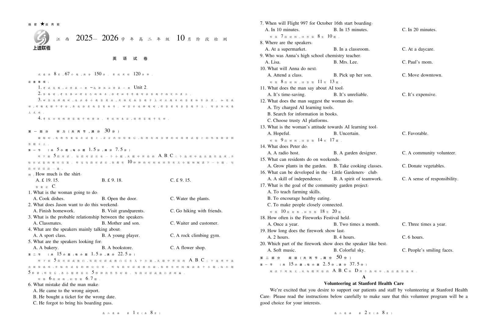 高二英语--江西省上进联考2025—2026学年高二年级10月阶段检测