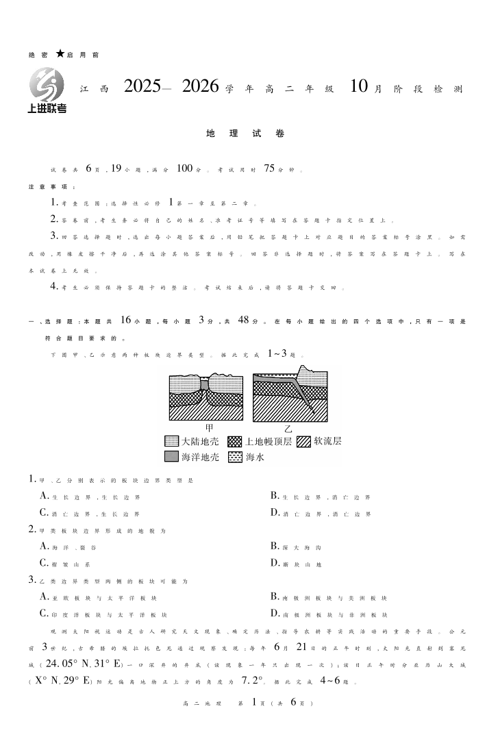 高二地理--江西省上进联考2025—2026学年高二年级10月阶段检测