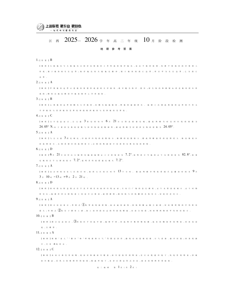 高二地理答案--江西省上进联考2025—2026学年高二年级10月阶段检测