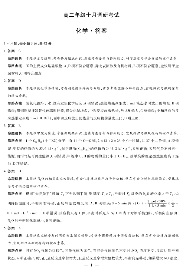 高二化学答案--安徽省天一大联考2025-2026学年高二年级10月调研考试