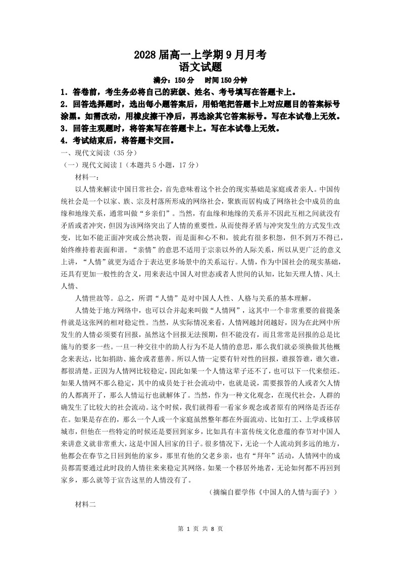 高一语文--四川省眉山市仁寿第一中学校(南校区)2025-2026学年高一上学期9月月考