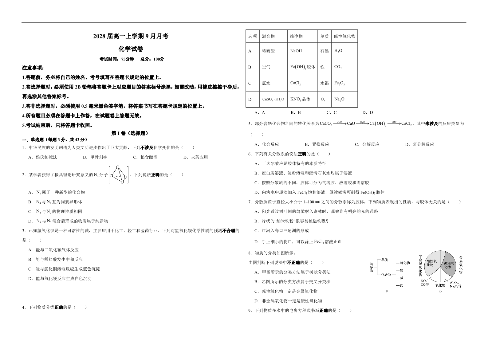 高一化学--四川省眉山市仁寿第一中学校(南校区)2025-2026学年高一上学期9月月考