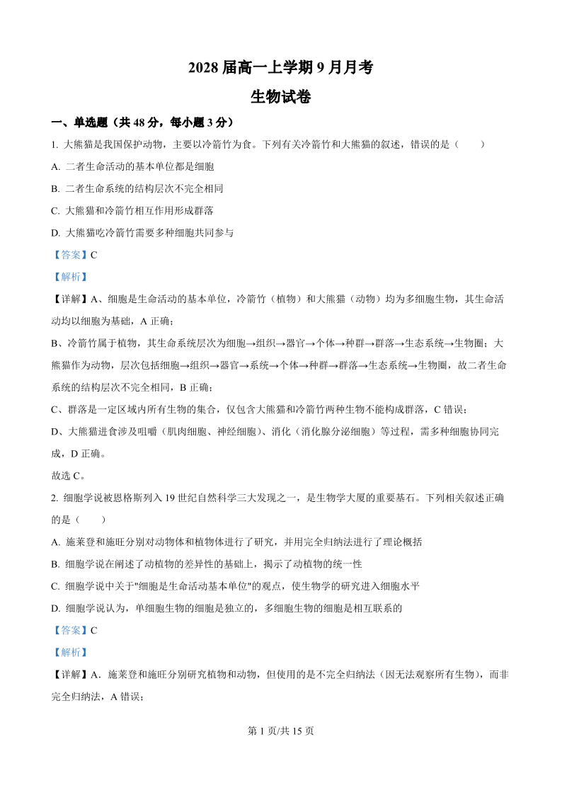 高一生物(精品解析版)--四川省眉山市仁寿第一中学校(南校区)2025-2026学年高一上学期9月月考