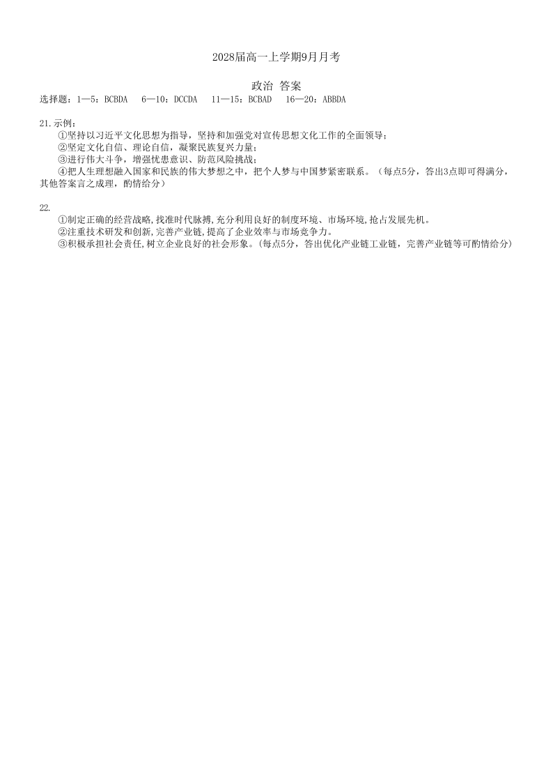 高一政治答案--四川省眉山市仁寿第一中学校(南校区)2025-2026学年高一上学期9月月考