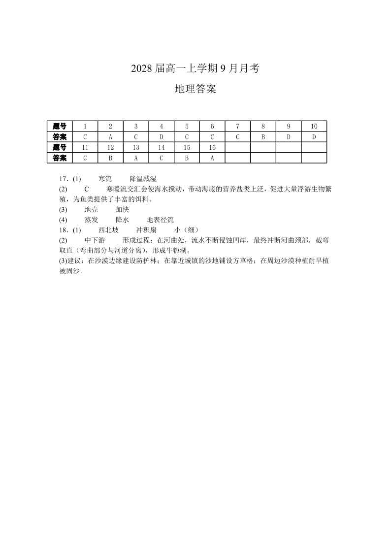高一地理答案--四川省眉山市仁寿第一中学校(南校区)2025-2026学年高一上学期9月月考