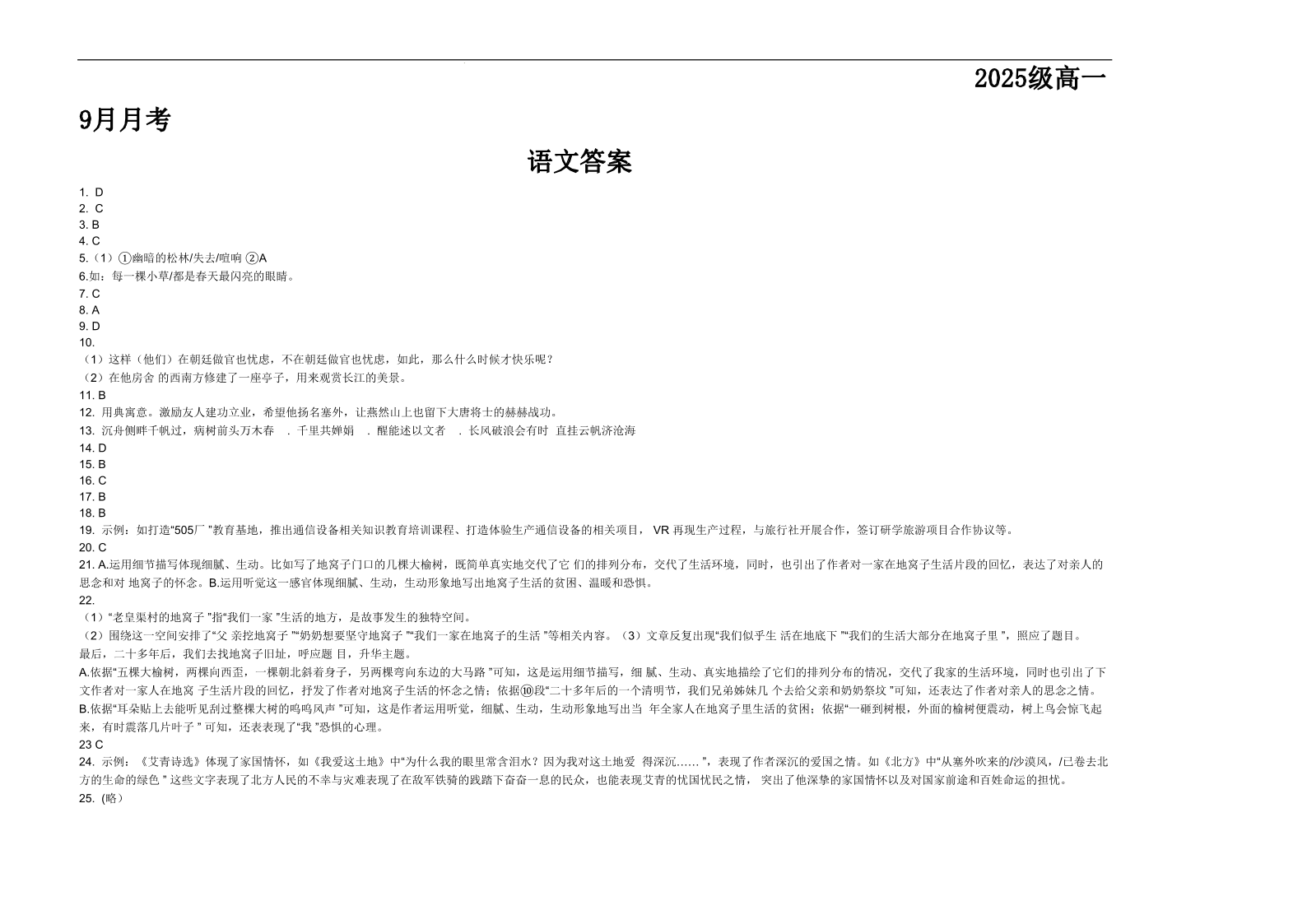 高一语文答案--四川省眉山市仁寿第一中学校(北校区)2025-2026学年高一上学期9月月考