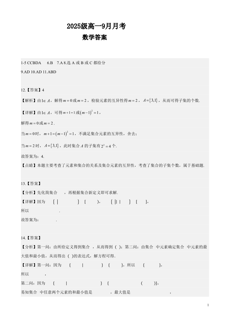高一数学答案--四川省眉山市仁寿第一中学校(北校区)2025-2026学年高一上学期9月月考