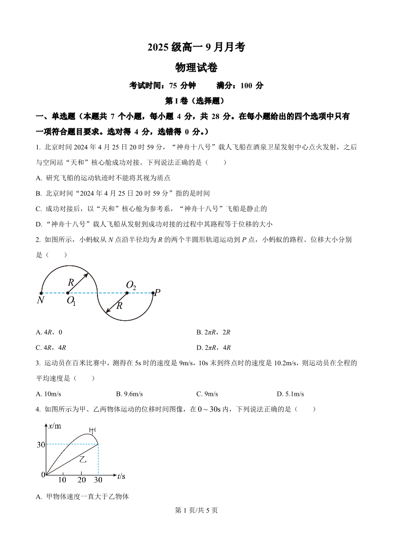 高一物理(原卷版)--四川省眉山市仁寿第一中学校(北校区)2025-2026学年高一上学期9月月考