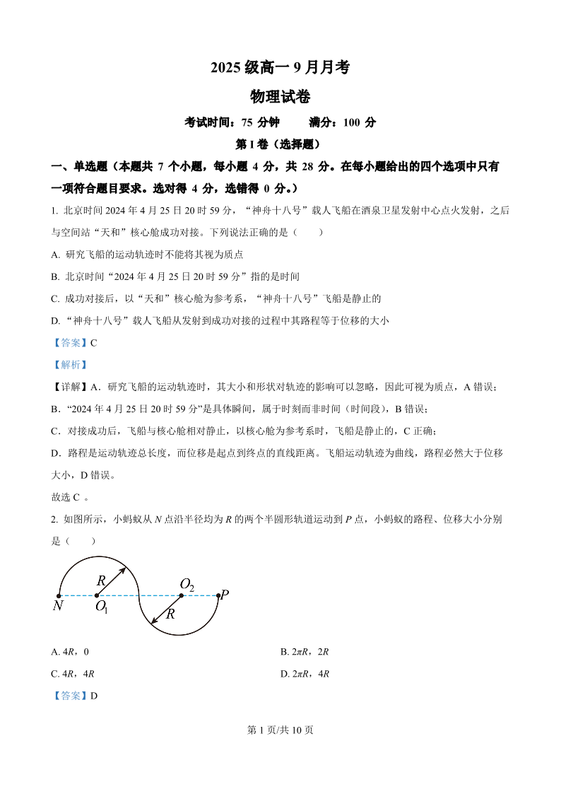 高一物理(解析版)--四川省眉山市仁寿第一中学校(北校区)2025-2026学年高一上学期9月月考