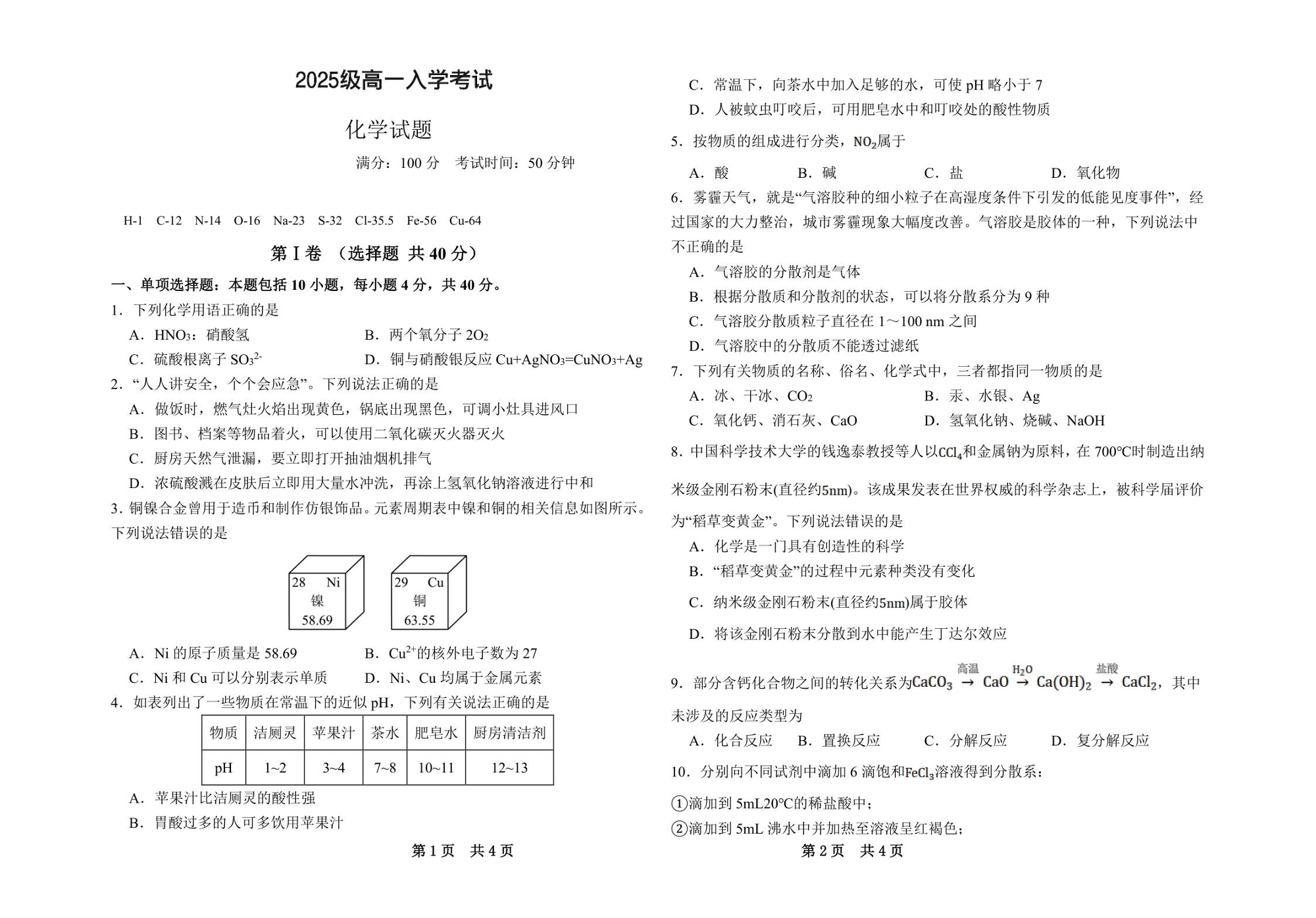 高一化学--四川省眉山市仁寿第一中学校(北校区)2025-2026学年高一上学期9月月考