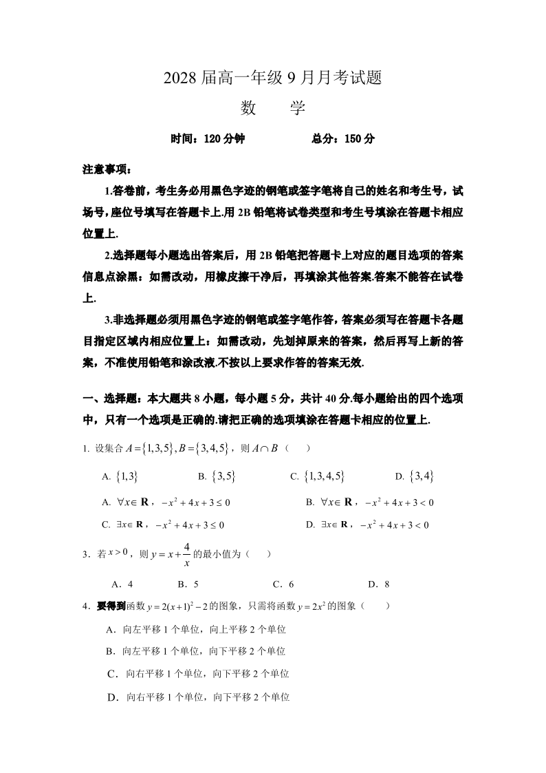 高一数学--陕西省汉中市西乡县第一中学2025-2026学年高一上学期9月月考