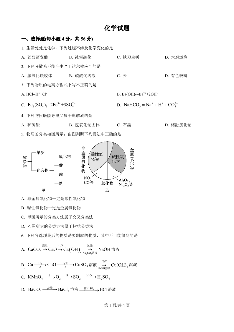 高一化学(原卷版)--陕西省汉中市西乡县第一中学2025-2026学年高一上学期9月月考